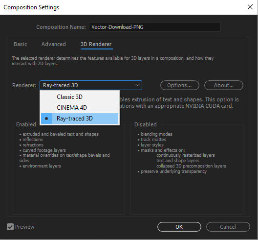 In the 3D Renderer tab, select the renderer as Ray-traced 3D. Your composition is now a Ray-traced 3D composition that allows for extruded text and shapes.