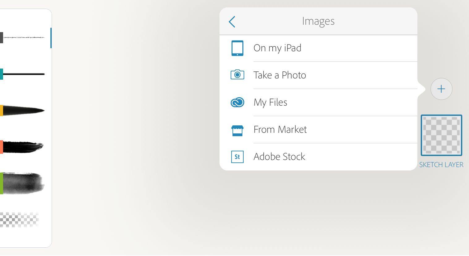Para usar uma imagem stock como plano de fundo para o seu trabalho artístico, toque no ícone Imagens e selecione Adobe Stock no menu Imagens.