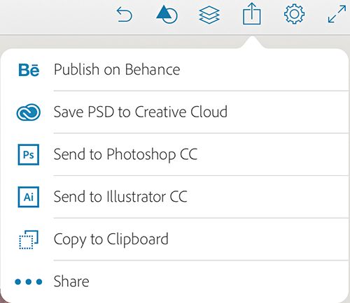 Salve sua forma em uma biblioteca apropriada da Creative Cloud em sua coleção ou use as opções Enviar para o Photoshop ou Enviar para o Illustrator para converter a forma em uma imagem com camadas vetoriais.