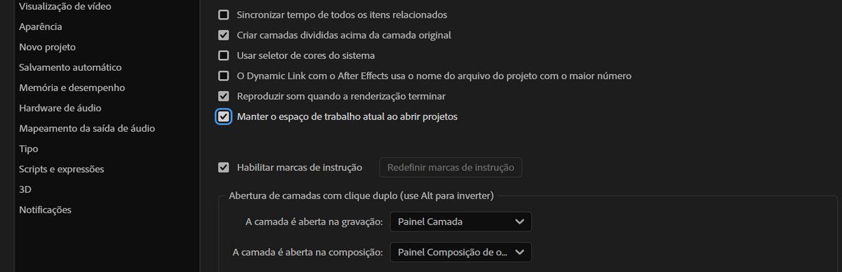 Uma nova preferência no After Effects permite manter o layout do espaço de trabalho atual ao abrir projetos salvos com um espaço de trabalho diferente. Ao habilitar a opção Manter área de trabalho atual ao abrir projetos (Preferências > Geral > Manter área de trabalho atual ao abrir projetos), o layout permanecerá consistente, eliminando a necessidade de reorganizar a área de trabalho toda vez que abrir um novo projeto. Isso garante que o espaço de trabalho permaneça inalterado, independentemente do projeto em que você esteja trabalhando.