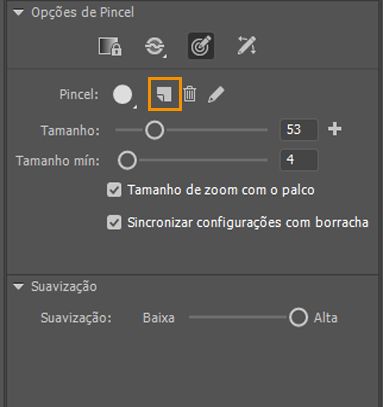 - Grava configurações do pincel como o tamanho de pincel, forma, e modo usados mais recentemente nas sessões do Animate