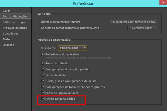 Os pincéis personalizados criados serão sincronizados com a nuvem por meio das preferências do Animate. Para fazer isso, navegue até Editar > Preferências no Windows ou Animate > Preferências no Mac. Veja abaixo a opção para sincronizar pincéis personalizados na seção "Configurações de sincronização":