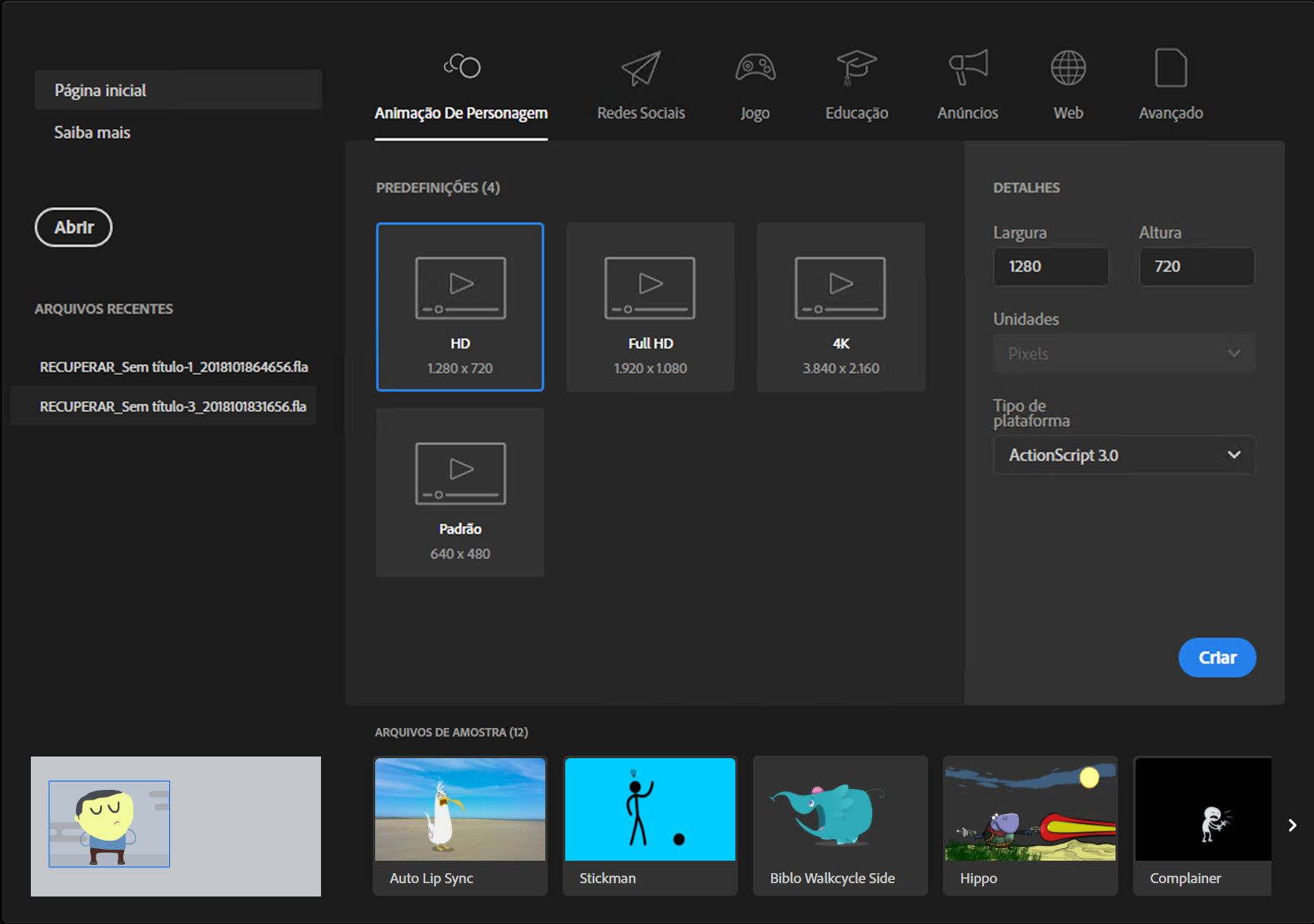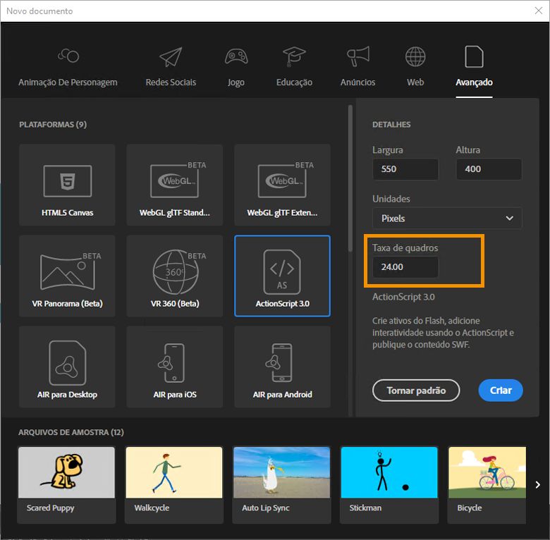 2. Converter projetos do Animate em outros formatos de tipo de documento