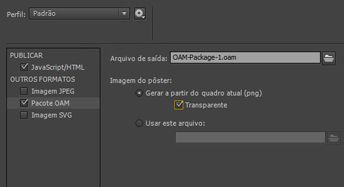 Agora você pode exportar o conteúdo do Animate em ActionScript, WebGL ou HTML5 Canvas para arquivos widget animados OAM (.oam). Os arquivos OAM gerados pelo Animate podem ser colocados no Dreamweaver, Muse e InDesign. Para exportar o conteúdo do Animate para o formato OAM, faça o seguinte: