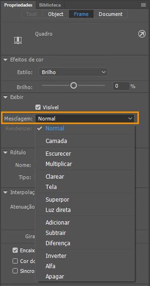 Para aplicar os modos de mesclagem em um quadro específico, primeiro selecione o quadro e escolha um modo de mesclagem listado na seção Exibição do painel Propriedades do quadro.