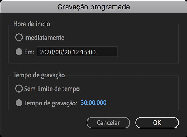 Posicione o indicador de reprodução onde deseja começar a gravar e pressione Gravar. A caixa de diálogo Gravação programada é exibida.