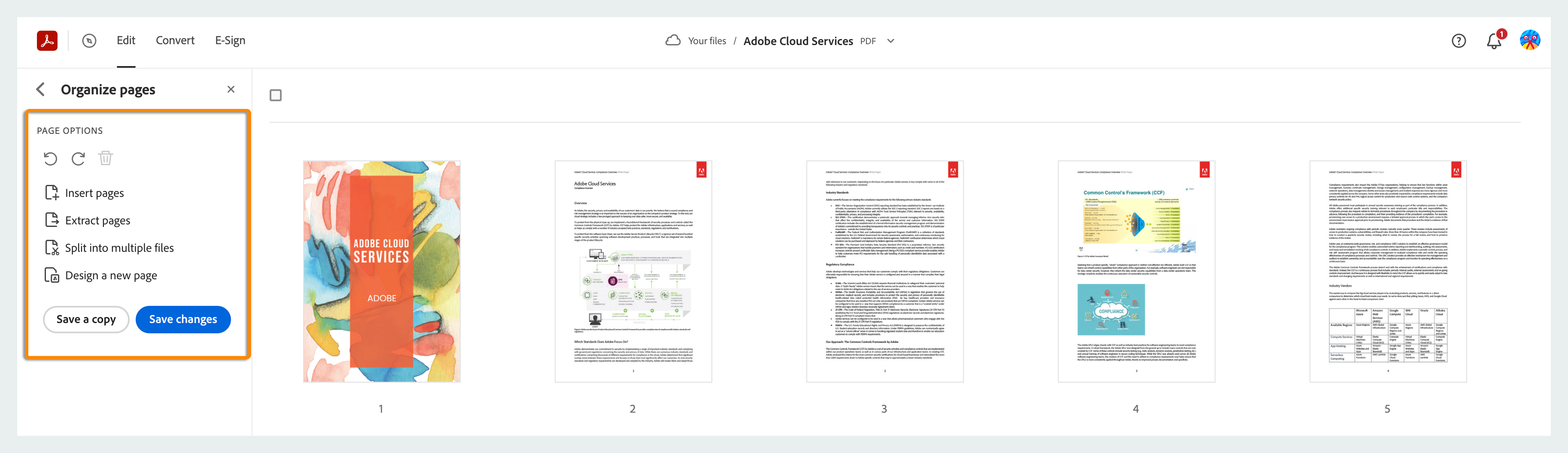 As páginas do PDF são reorganizadas e o arquivo é salvo automaticamente no armazenamento na nuvem da Adobe.