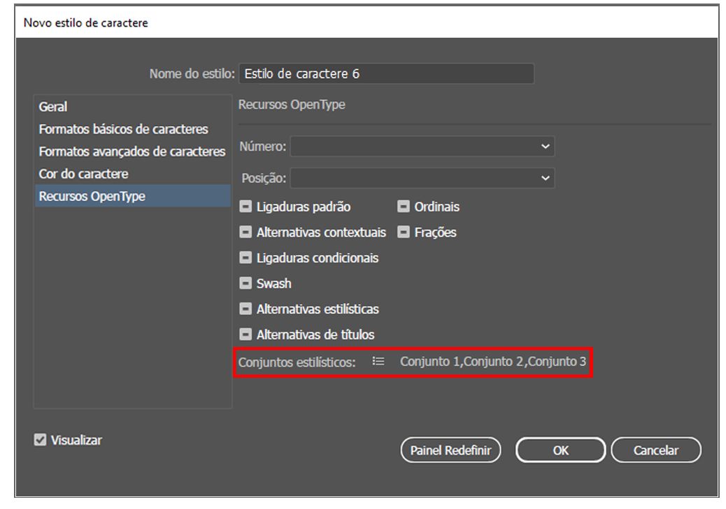 e escolha um conjunto da lista.Adicionar conjuntos estilísticos a um estilo de caractere Adicionar conjuntos estilísticos a um estilo de caractere Você pode aplicar vários conjuntos estilísticos a um intervalo de texto. Para saber mais sobre como aplicar conjuntos estilísticos a uma seleção de texto, consulte Caracteres especiais.