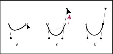 Desenho de um segmento reto seguido por um segmento curvado (parte 1) A. Segmento reto concluído B. Posicionando a ferramenta Caneta sobre a extremidade (o ícone Converter Pontos aparece somente no Illustrator e no InDesign) C. Arrastando o ponto de direção