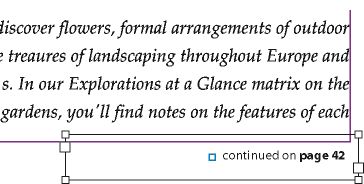 Você pode manter com facilidade as linhas de salto de matérias que continuam em outras páginas, como uma linha que indique “Continua na página 42”. Use um número de página de linha de salto para atualizar automaticamente o número da página com o próximo quadro de texto encadeado, ou com o anterior, ao mover ou fluir quadros de texto encadeados da matéria.