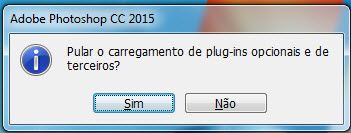 Mantenha pressionada a tecla Shift e inicialize o Photoshop. Uma caixa de diálogo é exibida durante a inicialização com a pergunta “Ignorar o carregamento de plug-ins opcionais e de terceiros?”