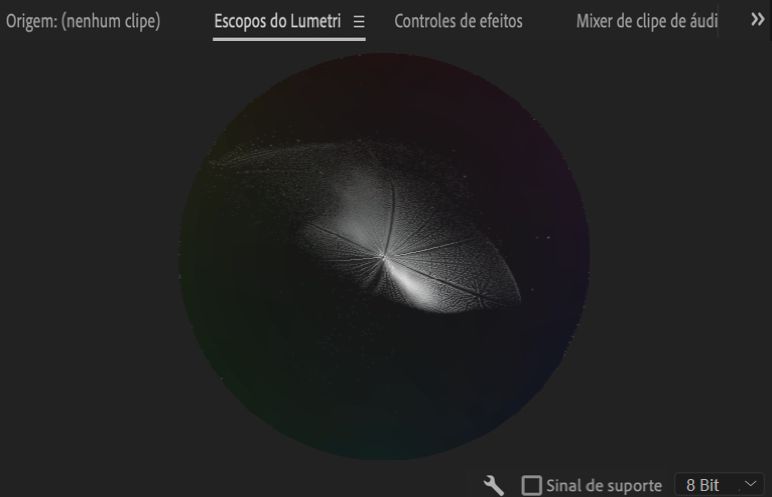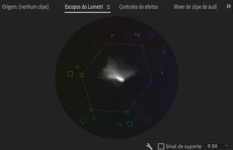 Um vetorscópio é um gráfico circular que monitora as informações de cor de uma imagem. Ele mede a saturação do centro para fora e mede a matiz em um padrão circular.