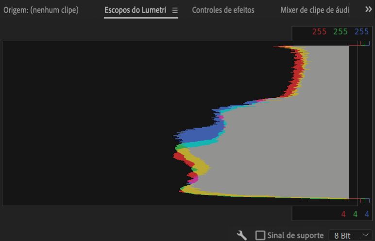 É possível exibir, a qualquer momento, todos os escopos no painel Escopos Lumetri. Apenas clique com o botão direito no painel Escopos Lumetri e selecione Predefinições > Todos os escopos RGB ou Todos os escopos YUV/YC.