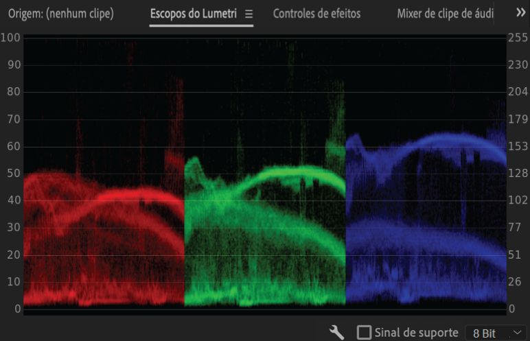 O escopo Padrão exibe formas de onda separadas para os diferentes componentes de uma imagem. As formas de onda são exibidas lado a lado, facilitando a comparação dos níveis relativos de cor em uma imagem e a realização dos ajustes, conforme necessário. O escopo Padrão também facilita localizar tons de cores na imagem.
