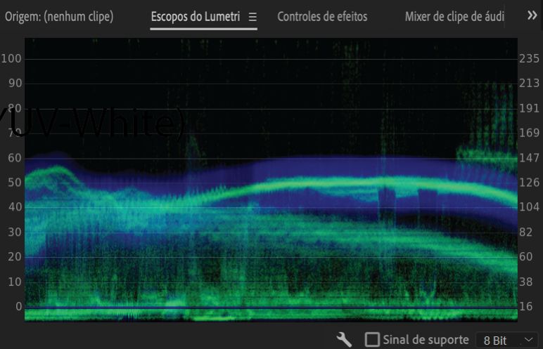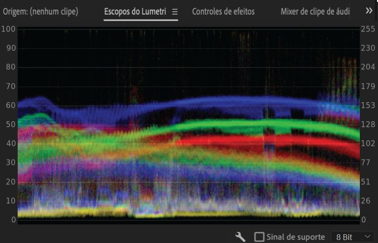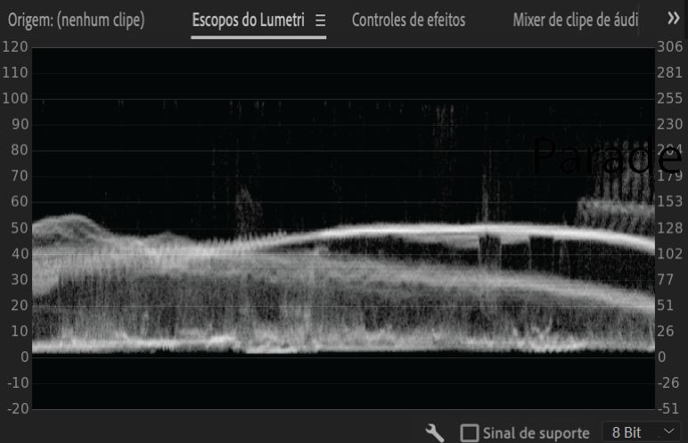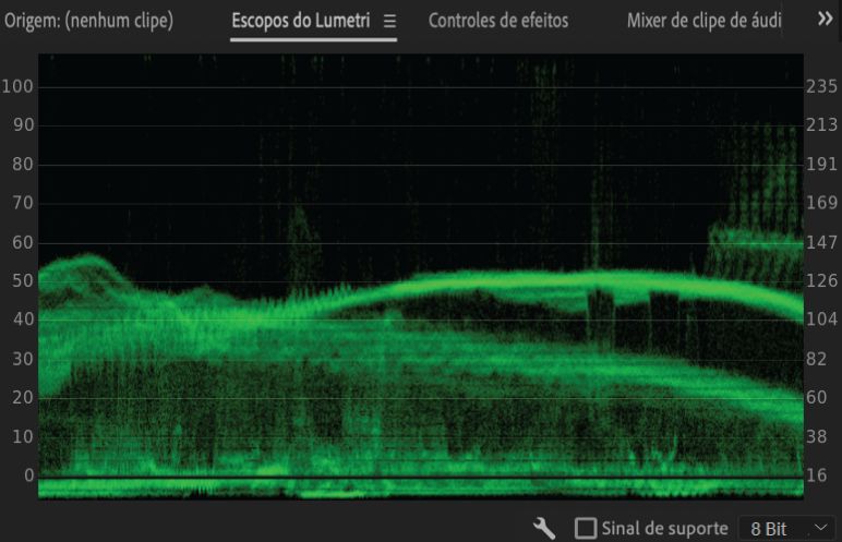 Selecione Sinal de fixação se deseja cortar qualquer sinal acima de 100 IRE ou abaixo de 0 IRE que seja exibido nos escopos. O sinal de fixação afeta a saída somente na janela Escopos Lumetri. Cortar o escopo não afeta o quadro que está sendo renderizado na linha do tempo ou na saída de exportação.