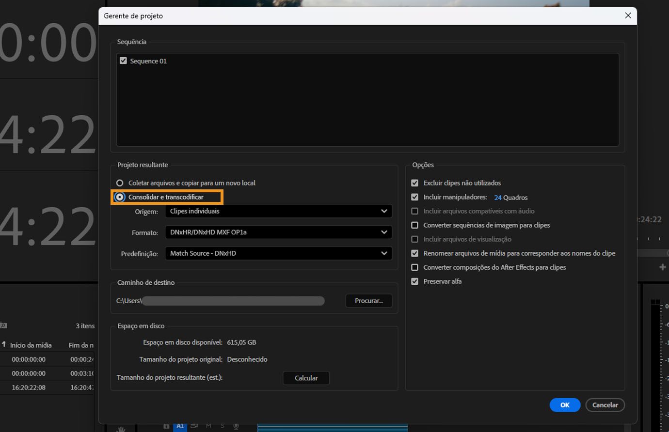 Selecione Consolidar e Transcodificar para compilar a mídia utilizada em um único codec, facilitando o arquivamento.