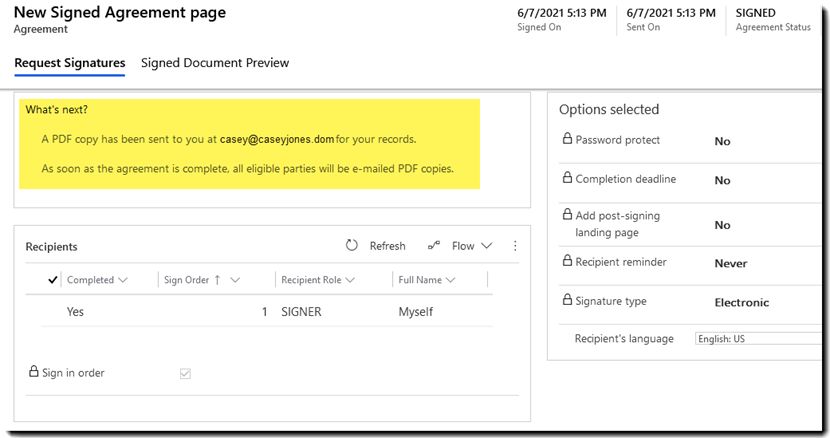 Correção de um problema em que os contratos no Dynamics 365 não refletiam um status “Concluído” para os destinatários mesmo após a conclusão do processo de assinatura. |