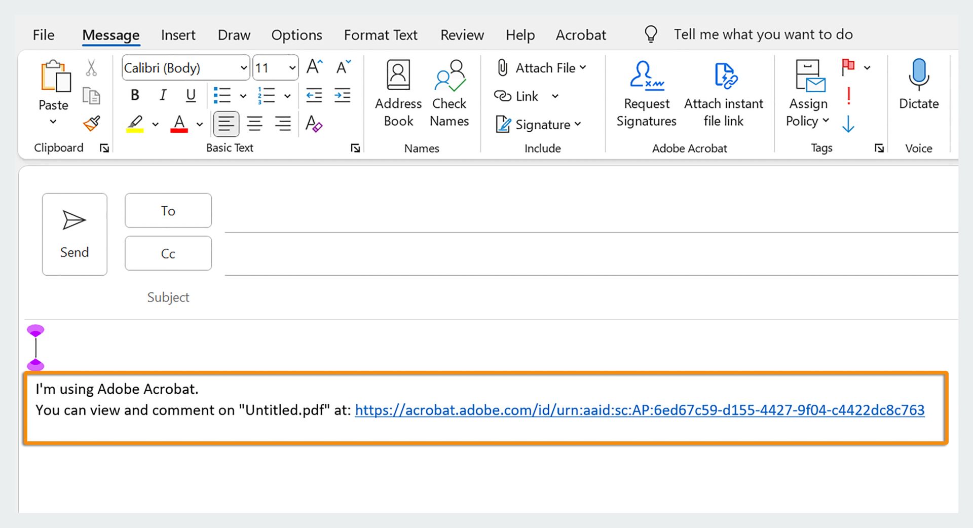 您可以使用适用于 Outlook 的 Adobe Acrobat 插件,通过 Outlook 将大型文件作为公共链接进行发送。附加的文件将上传至 Adobe 云存储,同时,指向这些文件的公共链接将会插入到电子邮件正文中。