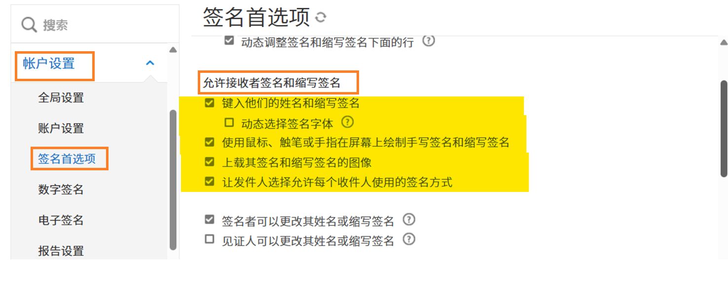 启用您愿意接受的签名样式:键入、绘制和图像。