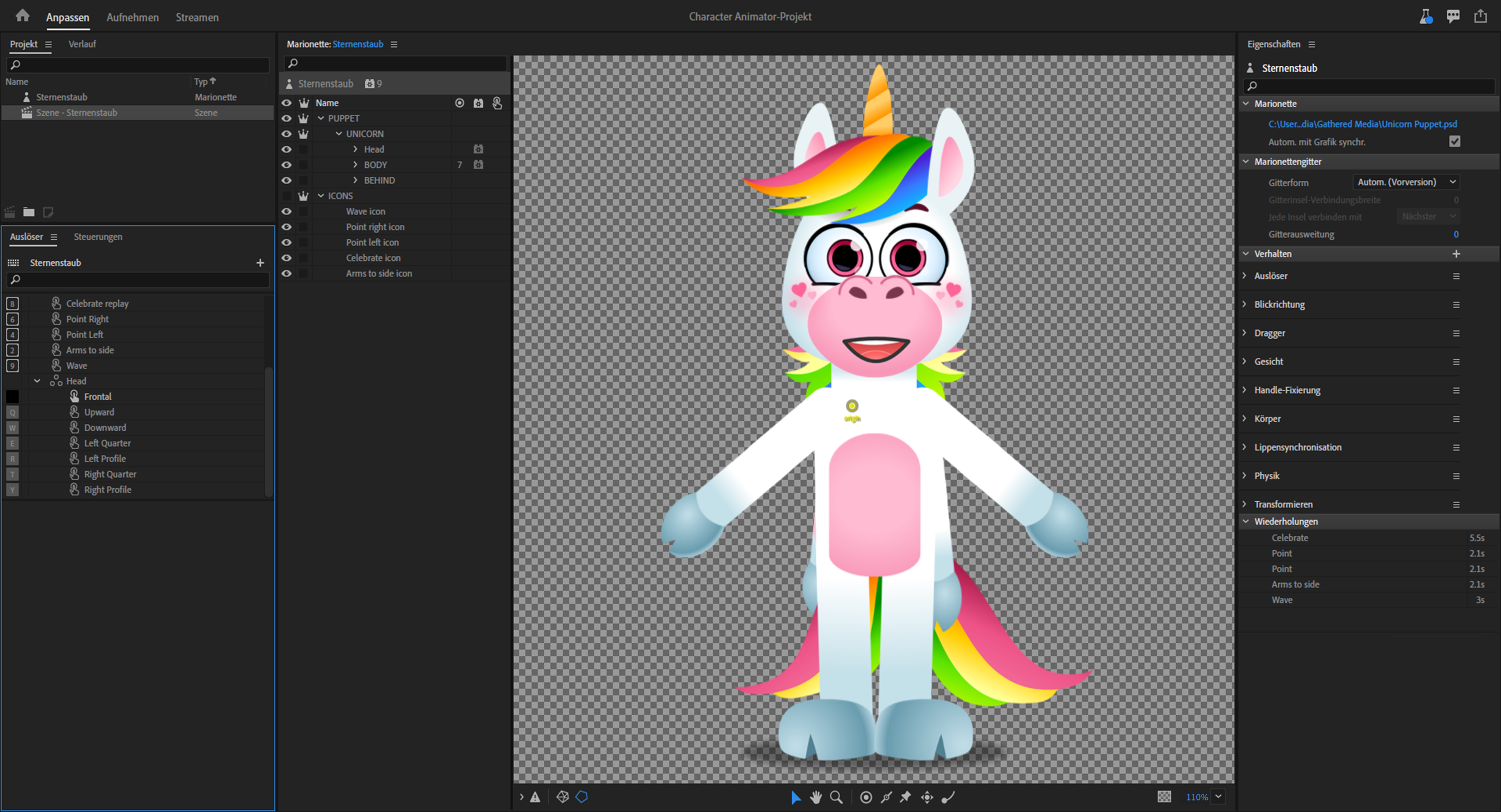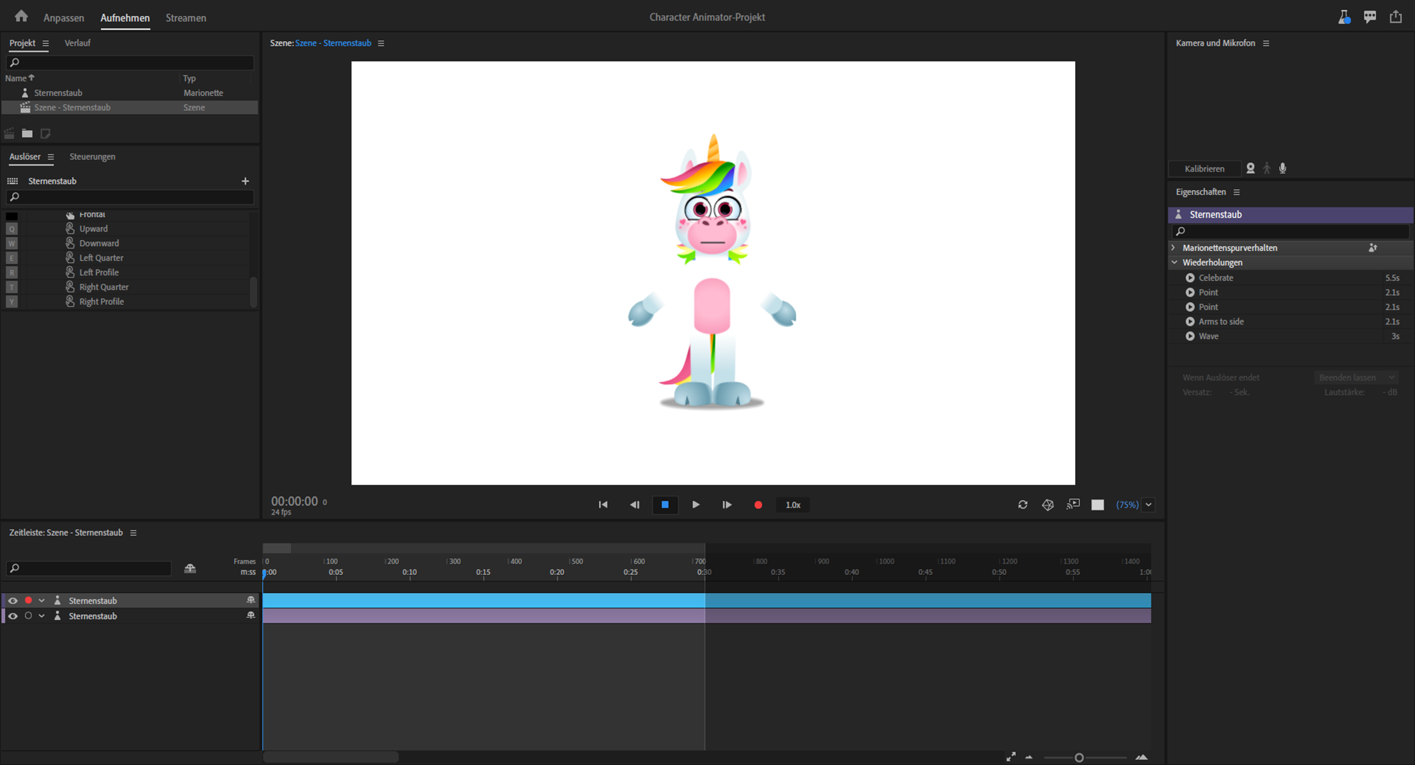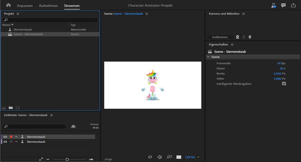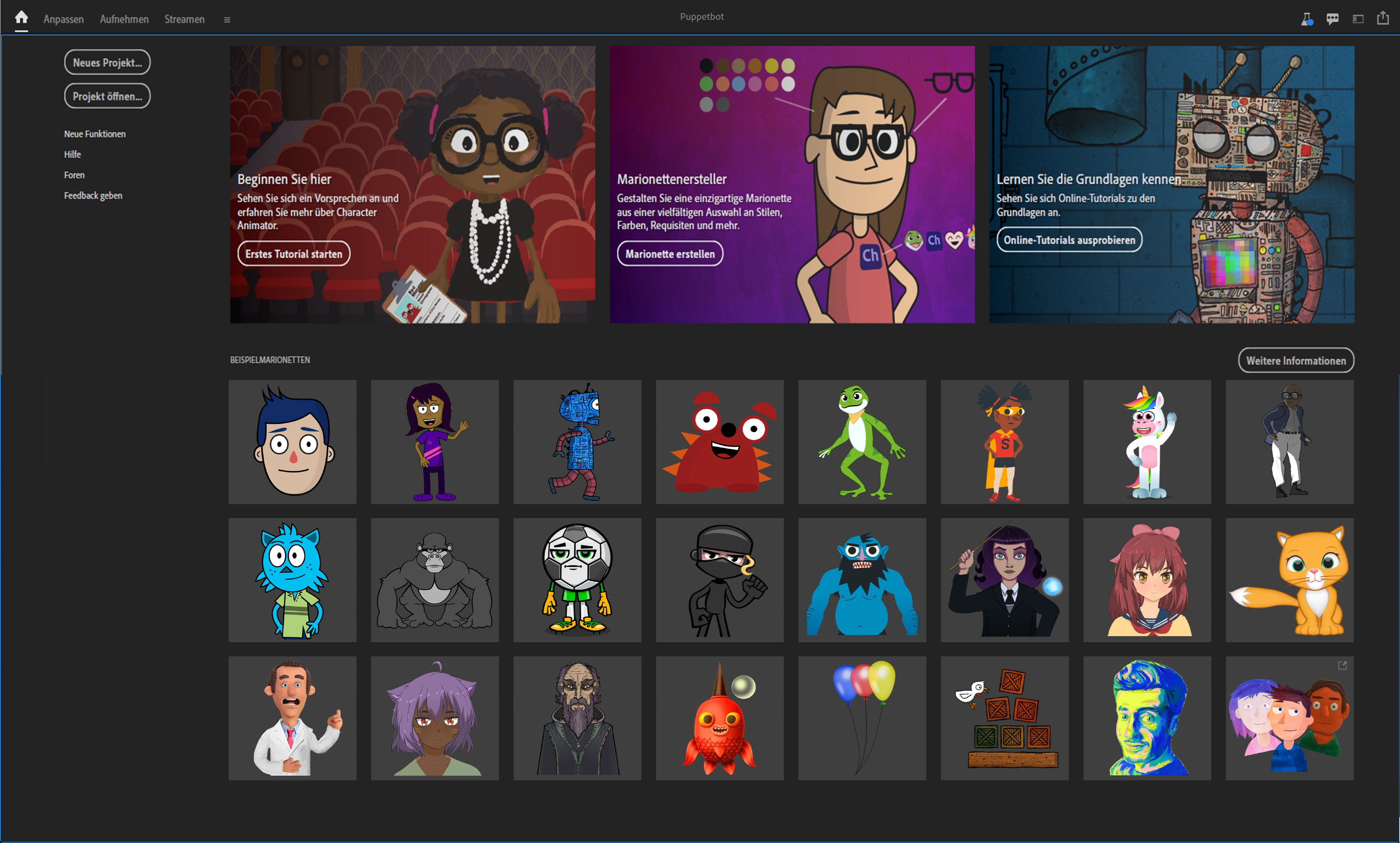 Der Startbildschirm wird angezeigt, wenn Sie die Anwendung starten. Der Arbeitsbereich enthält Ressourcen wie ein interaktives Video-Tutorial (Erste Schritte), hilfreiche Web -Ressourcen und Marionettenvorlagen. Sie können die Ressourcen nutzen, um Character Animator zu erlernen oder mit dem Animieren der Marionettenvorlagen zu experimentieren.