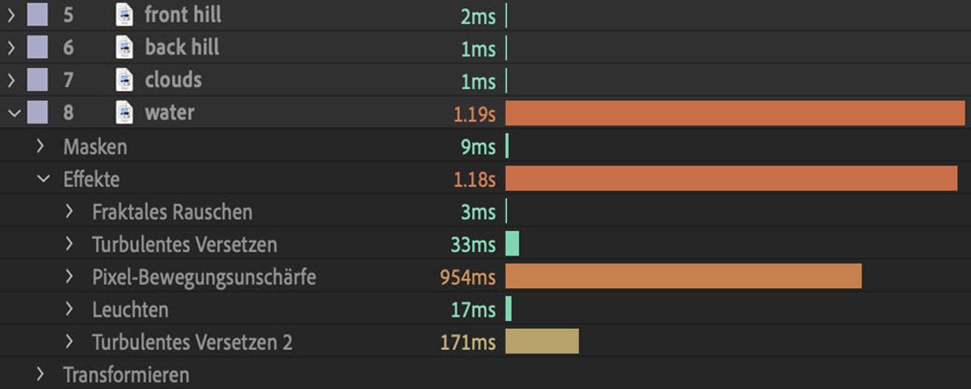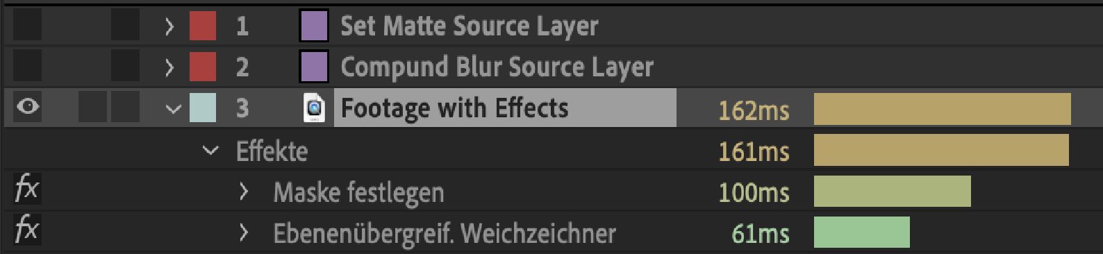 Da After Effects häufig zwischenspeichert, wählen Sie zum Profilieren eines Frames Bearbeiten > Bereinigen > Gesamten Arbeitsspeicher- und Datenträger-Cache, um zu erzwingen, dass dieser Frame von Grund auf neu berechnet wird.