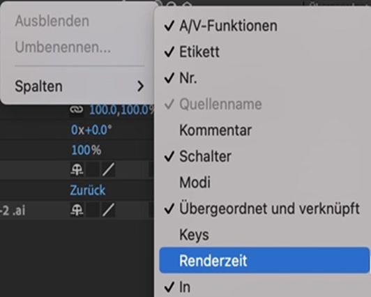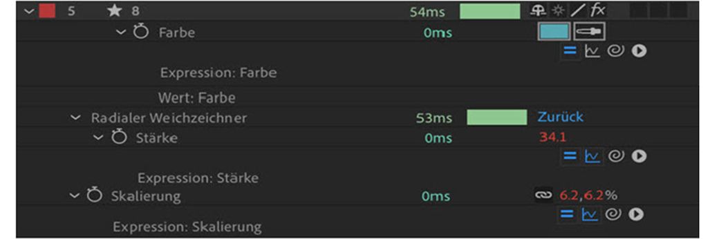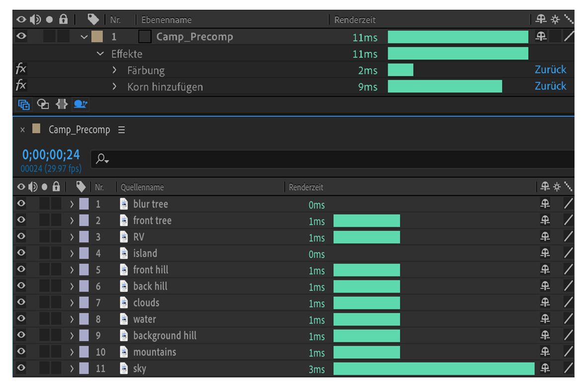 Ebenen, Effekte, Masken und Stile, die bereits ganz oder teilweise (im Zwischenspeicher) gerendert wurden, zeigen ihren Renderzeitwert mit einem Sternchen an.