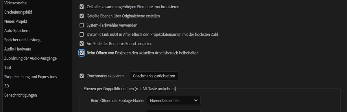 Mit einer neuen Voreinstellung in After Effects kannst du das aktuelle Arbeitsbereich-Layout beim Öffnen von Projekten beibehalten, die mit einem anderen Arbeitsbereich gespeichert wurden. Wenn du die Option Beim Öffnen von Projekten den aktuellen Arbeitsbereich beibehalten (Voreinstellungen > Allgemein > Beim Öffnen von Projekten den aktuellen Arbeitsbereich beibehalten) aktivierst, bleibt dein Layout konsistent, sodass du deinen Arbeitsbereich nicht mehr jedes Mal neu anlegen musst, wenn du ein neues Projekt öffnest. So ist sichergestellt, dass dein Arbeitsbereich unverändert bleibt, unabhängig davon, an welchem Projekt du gerade arbeitest.