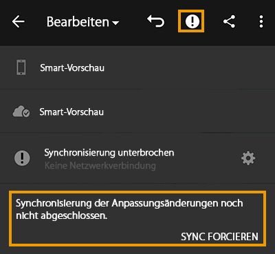 Wenn du die Option Mobildaten verwenden in den App-Einstellungen deaktivierst und keine Netzwerkverbindung vorhanden ist, zeigt Lightroom for mobile das Symbol Synchronisierung unterbrochen