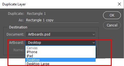 Wenn du eine Ebene oder Ebenengruppe in einem Dokument duplizierst, das Zeichenflächen enthält, kannst du die Zeichenfläche auswählen, in der du die duplizierte Ebene platzieren möchtest.