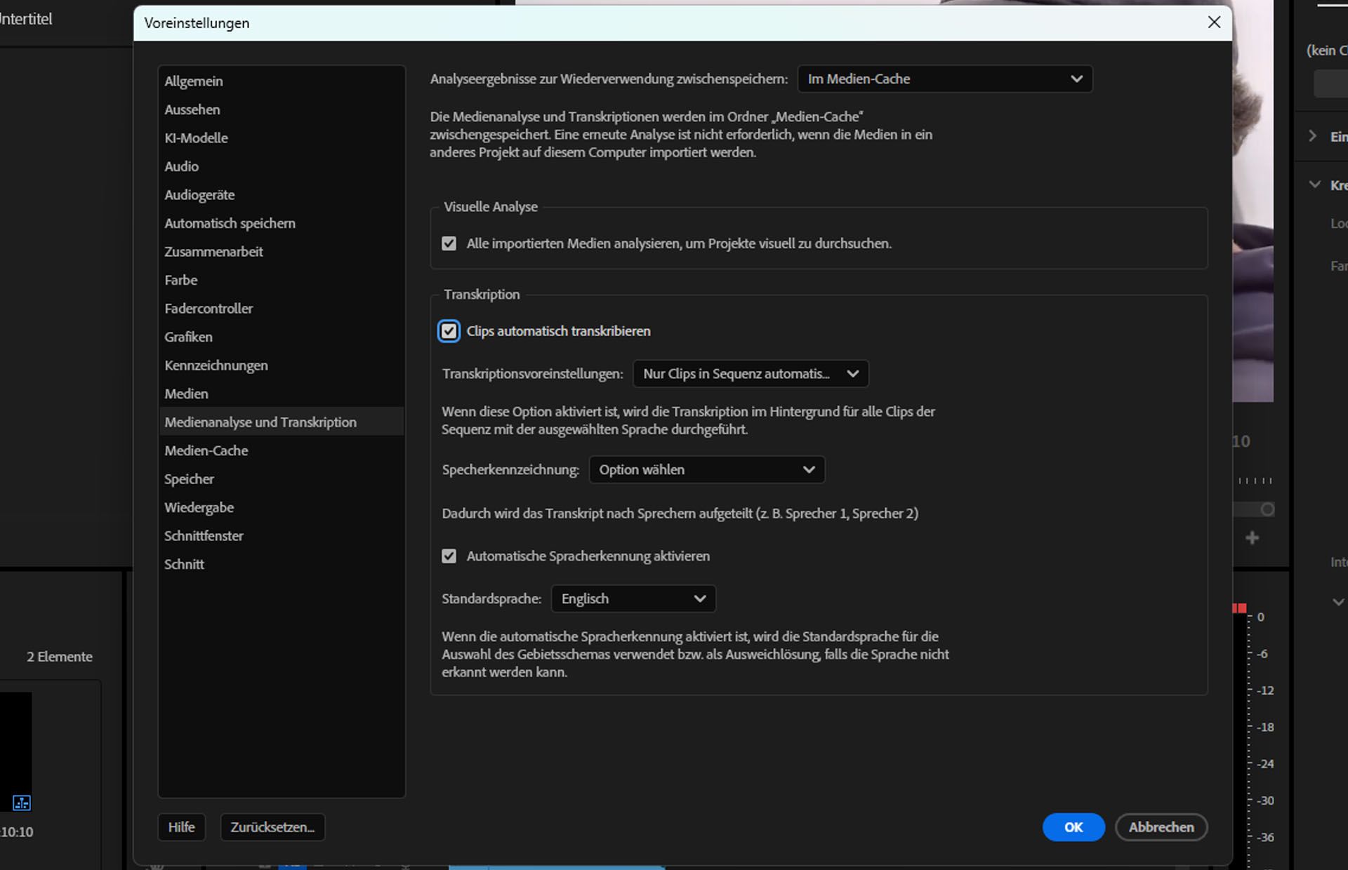 Premiere Pro speichert die Ergebnisse der Analyse in einem Cache, sodass das in verschiedenen Projekten oder von verschiedenen Benutzenden verwendete Filmmaterial nicht erneut analysiert werden muss. Du kannst die Analysemetadaten so speichern, wie dies für dich am besten ist.