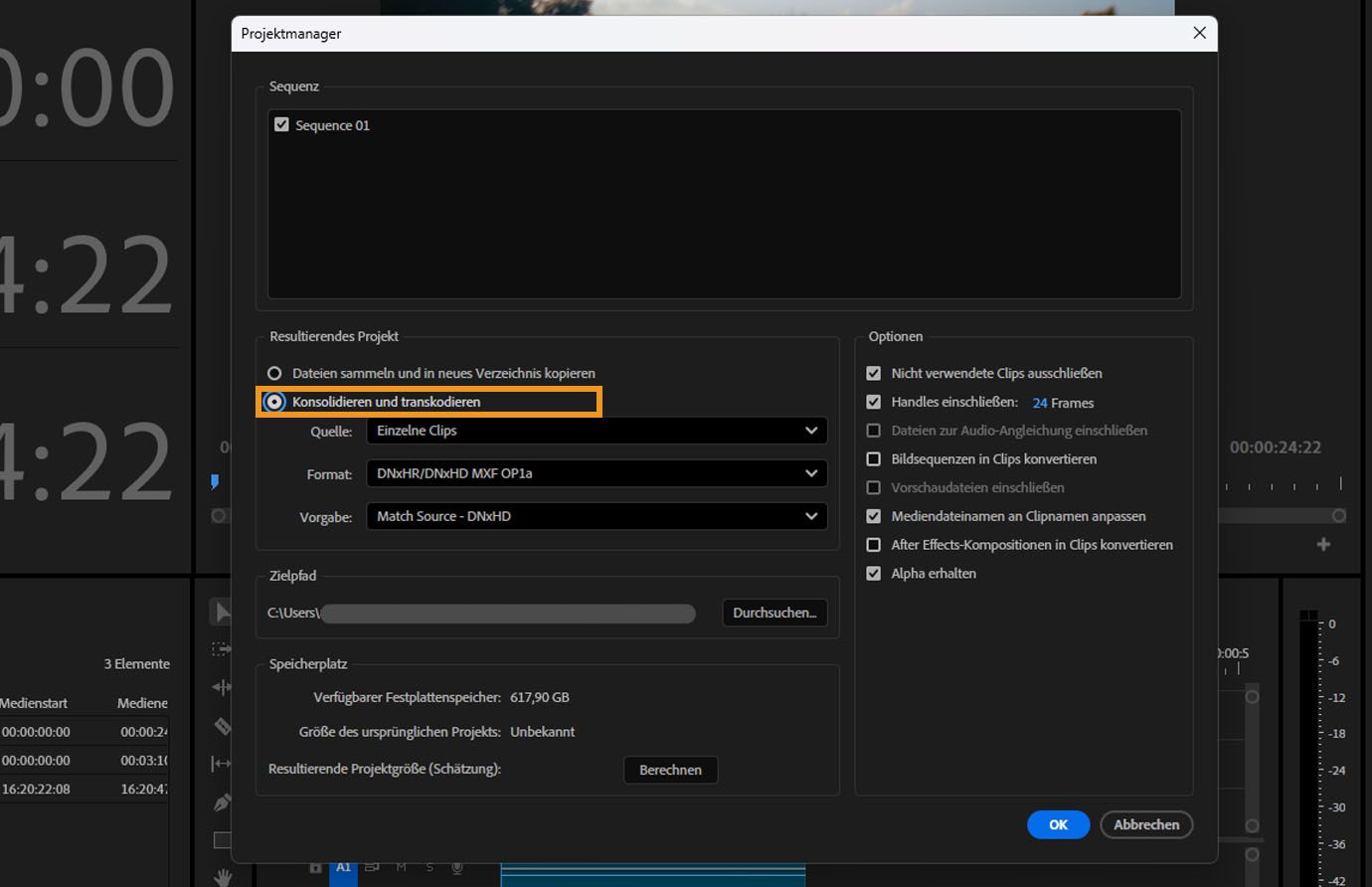 - Nicht verwendete Clips ausschließen: Aktiviere dies, um Medien auszulassen, die in den ausgewählten Sequenzen nicht verwendet werden.