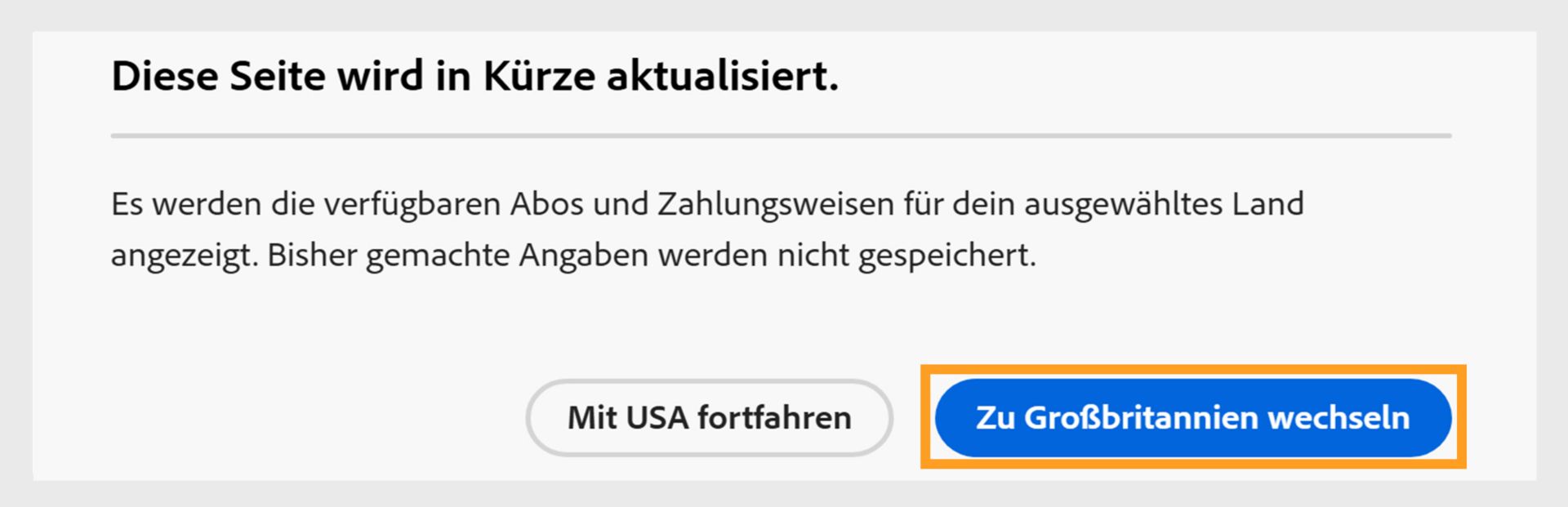 Wenn du kein aktives Abonnement hast, kannst du das mit deinem Adobe-Konto verknüpfte Land ändern, wenn du ein neues Abonnement erwirbst.