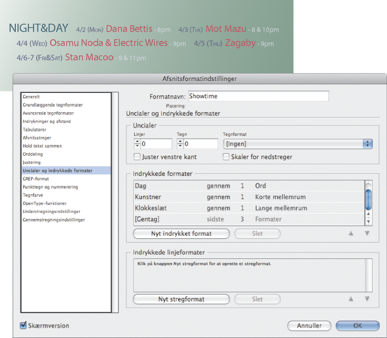 Du kan føje indrykkede linjeformater til et afsnitsformat ved at dobbeltklikke på afsnitsformatet og derefter klikke på Uncialer og indrykkede formater.