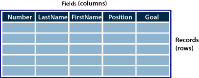 A collection of data stored in tables. Each row of a table constitutes one record and each column constitutes a field in the record, as shown in the following example: