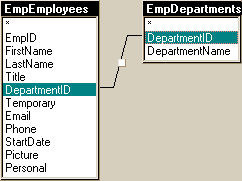 A database containing more than one table, with the tables sharing data. The following database is relational because two tables share the DepartmentID column.