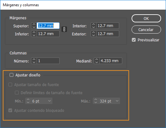 En el cuadro de diálogo Márgenes y columnas, seleccione Ajustar diseño. La casilla de verificación aparecerá desactivada de forma predeterminada.
