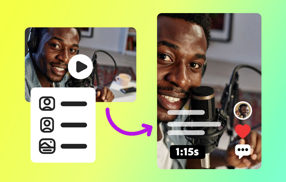 Upload any video and let Adobe Express find the highlights, add captions automatically, and export in any aspect ratio, such as Reel, landscape, portrait, square, and more, in seconds.