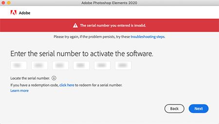 Sarjanumerossa ja lunastuskoodissa on molemmissa 24 elementtiä. Sarjanumero on kuitenkin 24 numeroa, kun taas lunastuskoodissa on 24 aakkosnumeerista merkkiä. Jos annat sarjanumeron sijaan lunastuskoodin, saat seuraavan virheilmoituksen: