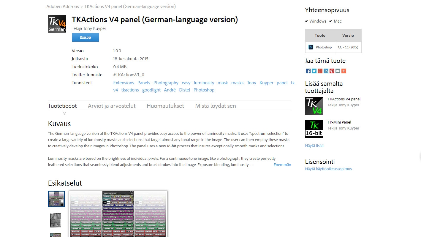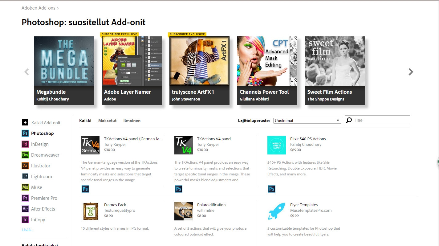 Valitse Adobe Add-ons -sivuston vasemman reunan sovellusluettelosta Photoshop, niin näyttöön tulevat vain Photoshopin laajennukset.