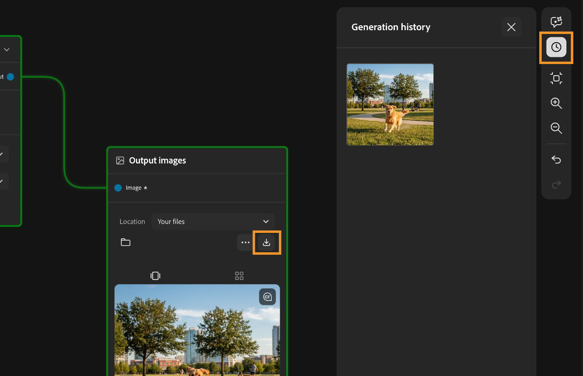 If you wish to find or download the assets generated in the workflows, go to the right rail and select the Generation history icon.