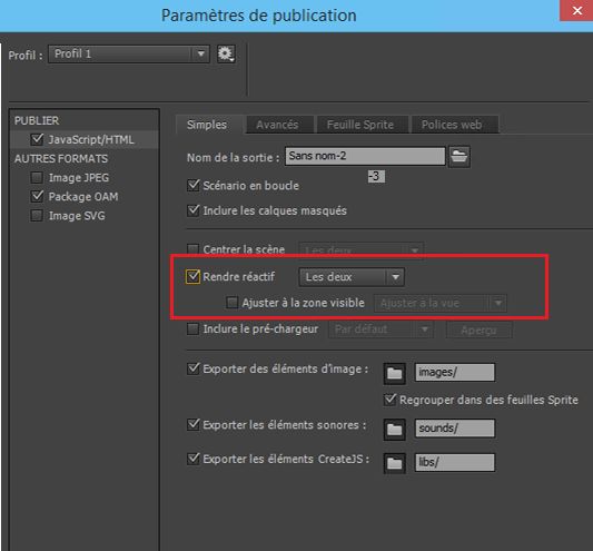 - Spécification des paramètres de publication pour Animate