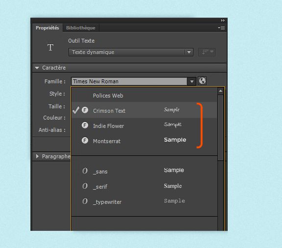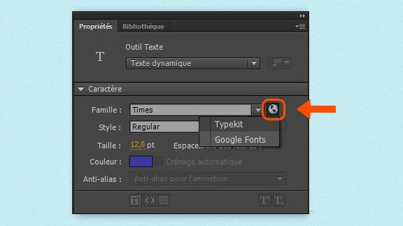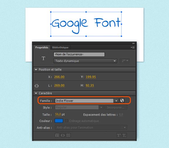 Pour afficher les polices ajoutées dans Animate, sélectionnez Caractère > Famille dans l’inspecteur des propriétés.