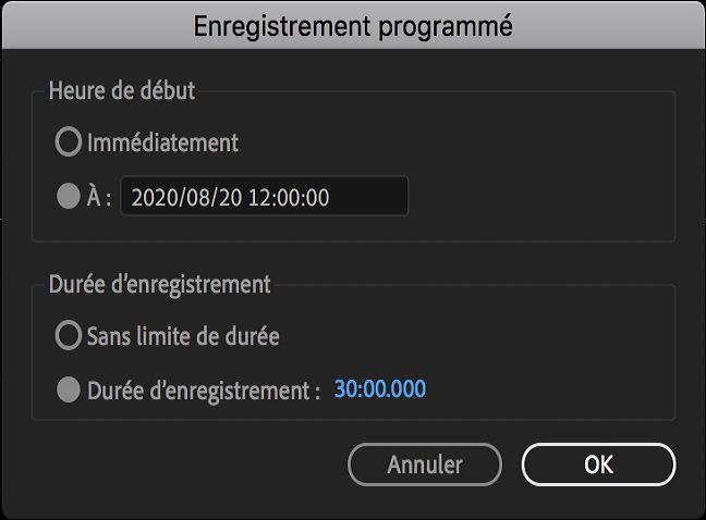 Boîte de dialogue de l’enregistrement programmé Boîte de dialogue de l’enregistrement programmé - Heure de début : vous pouvez modifier la date et l’heure de début de l’enregistrement. Par défaut, l’heure de début est fixée à 15 minutes à compter du moment où la boîte de dialogue a été ouverte. Vous pouvez choisir de commencer à enregistrer immédiatement en sélectionnant Immédiatement.