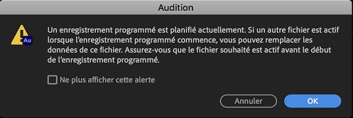 Remarque :Pendant cette période, il est déconseillé d’effectuer d’autres modifications. Toute tentative d’ouverture ou de passage à un autre fichier déclenche un avertissement indiquant qu’un enregistrement programmé est planifié, comme indiqué ci-dessous. Audition enregistre dans le fichier actif du panneau Éditeur (quel qu’il soit). Afin d’éviter de perdre vos données, il est déconseillé d’utiliser Audition en attendant le début de l’enregistrement.