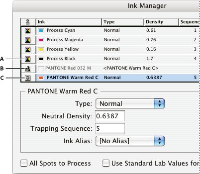 Les options du Gestionnaire d’encres sont particulièrement pratiques pour les prestataires de services d’impression. Par exemple, si un travail comprend un ton direct, un prestataire de services peut ouvrir le document et convertir ce ton direct en équivalent quadrichromique (CMJN). Lorsqu’un document contient deux tons directs similaires alors qu’il n’en a besoin que d’un seul ou qu’un ton direct porte deux noms différents, un prestataire de services a la possibilité d’attribuer un seul pseudonyme aux deux noms.
