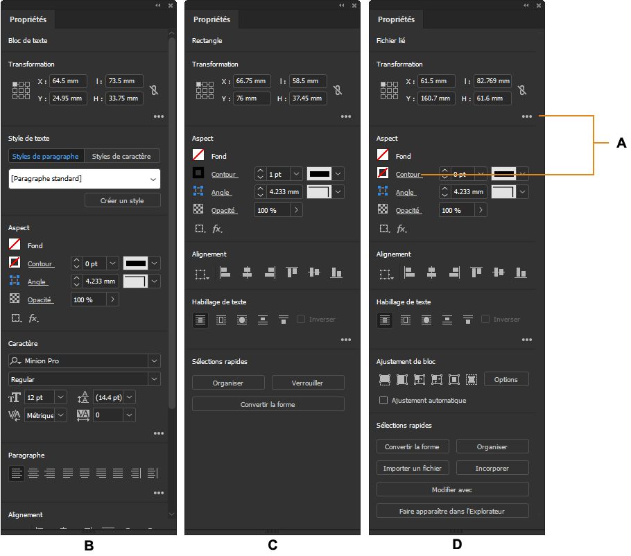 - Commandes dynamiques : des commandes supplémentaires, selon le contenu de votre sélection, peuvent être mises à disposition. Par exemple, vous pouvez régler les attributs de caractère et de paragraphe des objets texte. Pour les objets image, le panneau Propriétés affiche les commandesConvertir la forme, Disposition, Remplacerl’image, Incorporer ou Annuler l’incorporation, Modifier avec, Afficher dans l’explorateur.