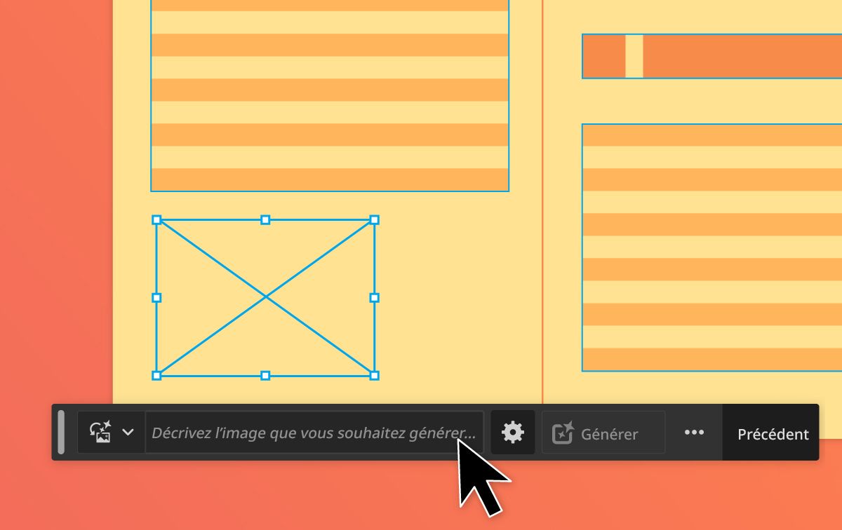 Générez des images à partir de prompts textuels simples avec la fonctionnalité Du texte à l’image. Consultez les exemples de prompts proposés, ajoutez des images de référence et appliquez des effets de style à partir de la boîte de dialogue Avancé.