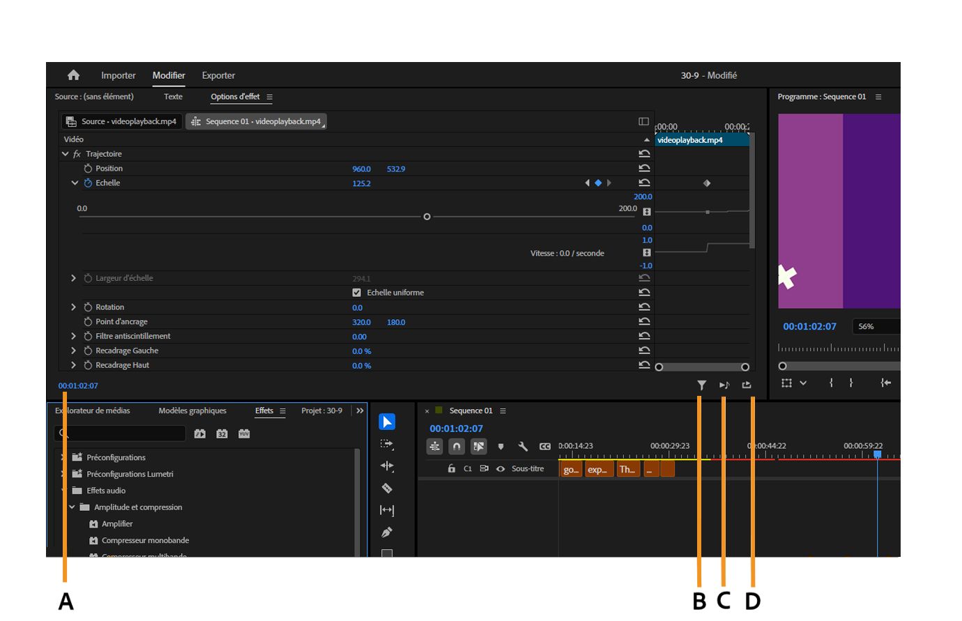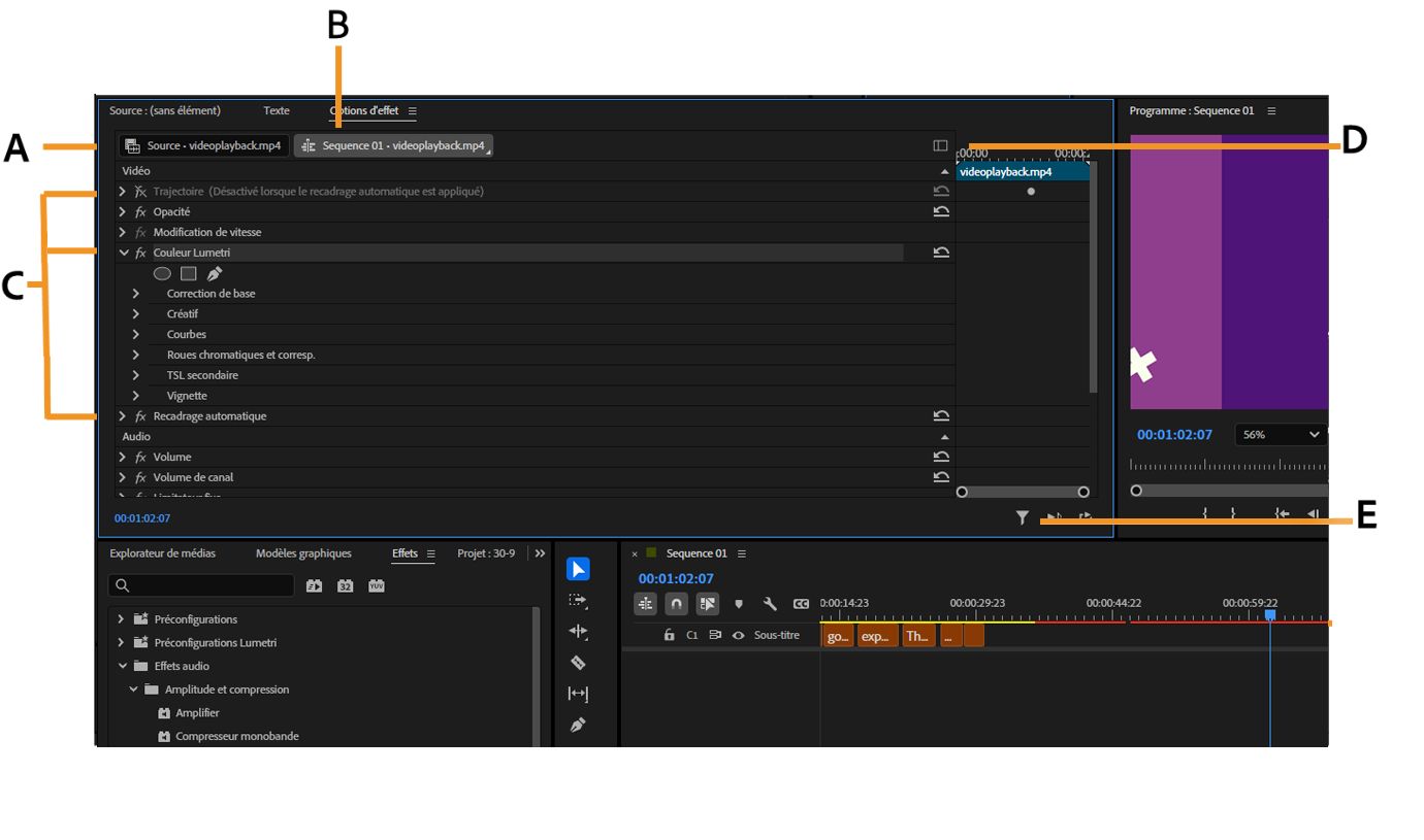 A. Nom de la séquence B. Nom du clip C.Effets D.Option Afficher/masquer la fenêtre de montage E.Option Filtrer les propriétés