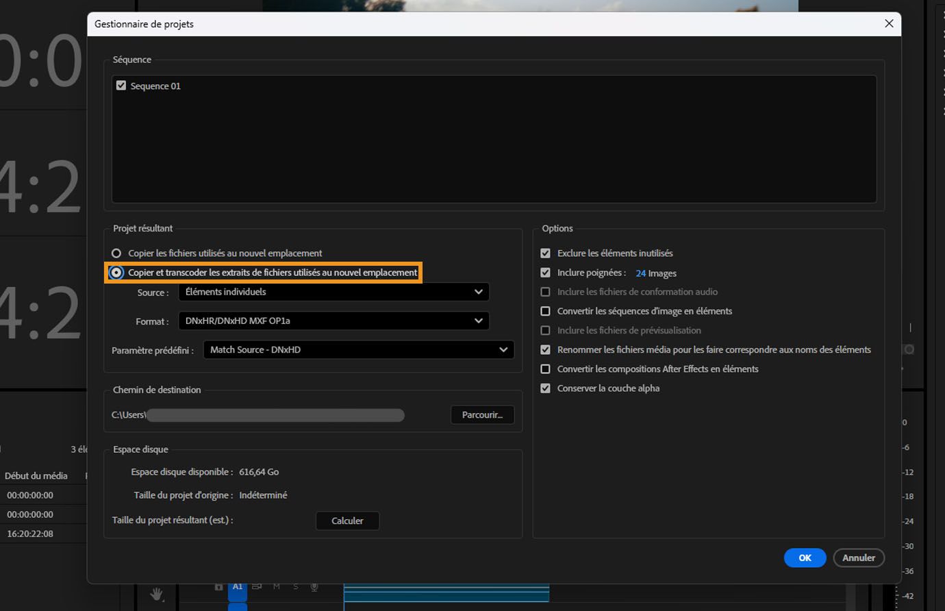 - Exclure les clips inutilisés : activez cette option pour omettre les médias non utilisés dans les séquences sélectionnées.