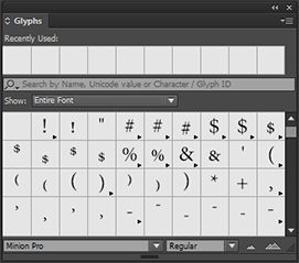 - Click the cycle widget (it’s located to the left of the word "Glyphs" on the Glyphs panel) to change views of the panel. Clicking the widget presents these views in succession: the collapsed panel, the entire panel, and the panel without recently used glyphs.